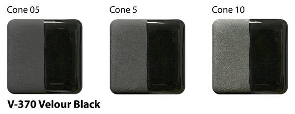 Velour Black Velvet Underglaze is a warm black color that is deep and velvety at cone 05, darkens and becomes warmer at cone 5, and is silky and deep at cone 10. A clear glaze deepens the color of the underglaze significantly at any temperature.